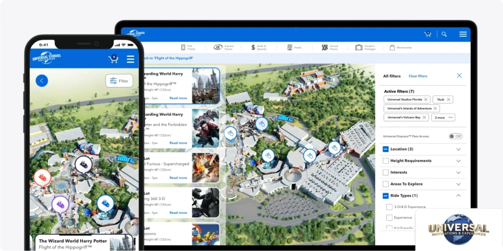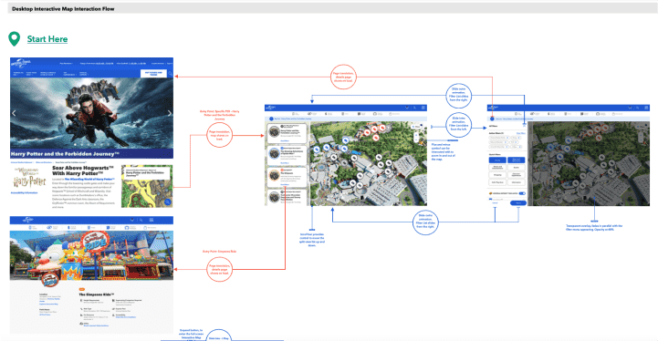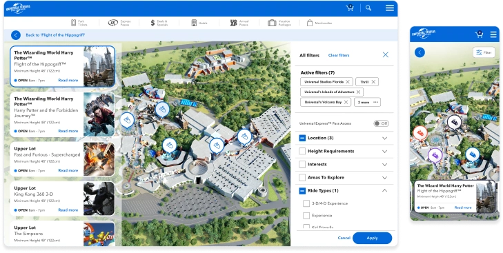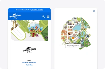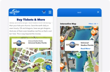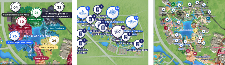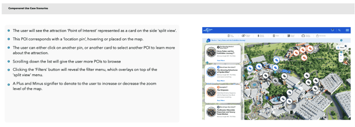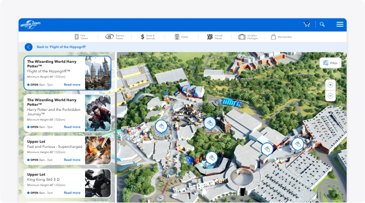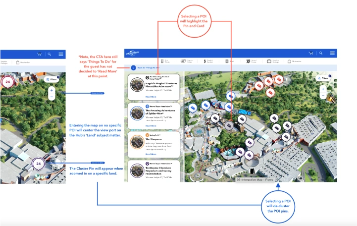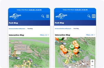 Leverage a modern and intuitive design solution for the Universal websites – Interactive Map, to reference where a “Point of Interest” (POI) is compared to other locations within the Universal theme park domain.