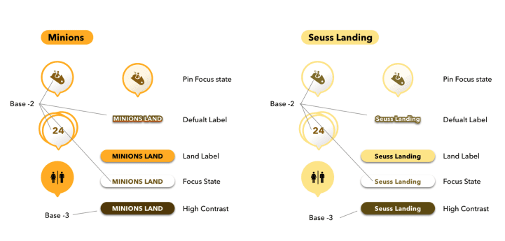 The new Global Design System map pins are colored to represent different attractions located within Universal Park lands.