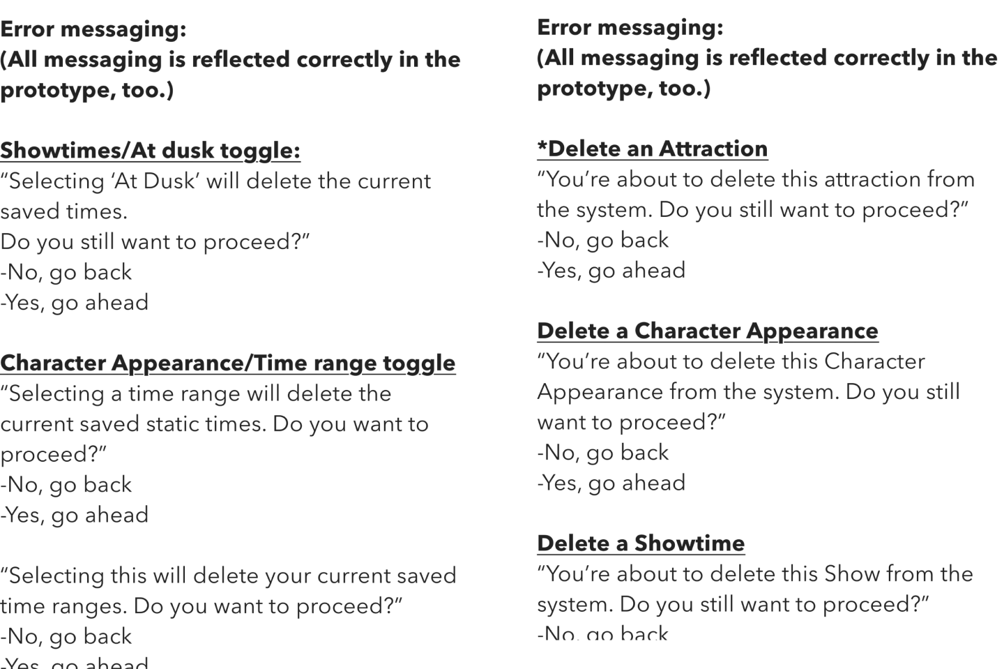Showtimes, Attractions, and Character Appearances needed unique configurations.