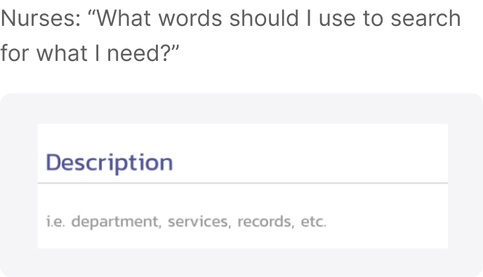 - UX writing: I added search + input suggestions in each table and search field so that nurses wouldn’t need to think about what information they might want to input for future reference.