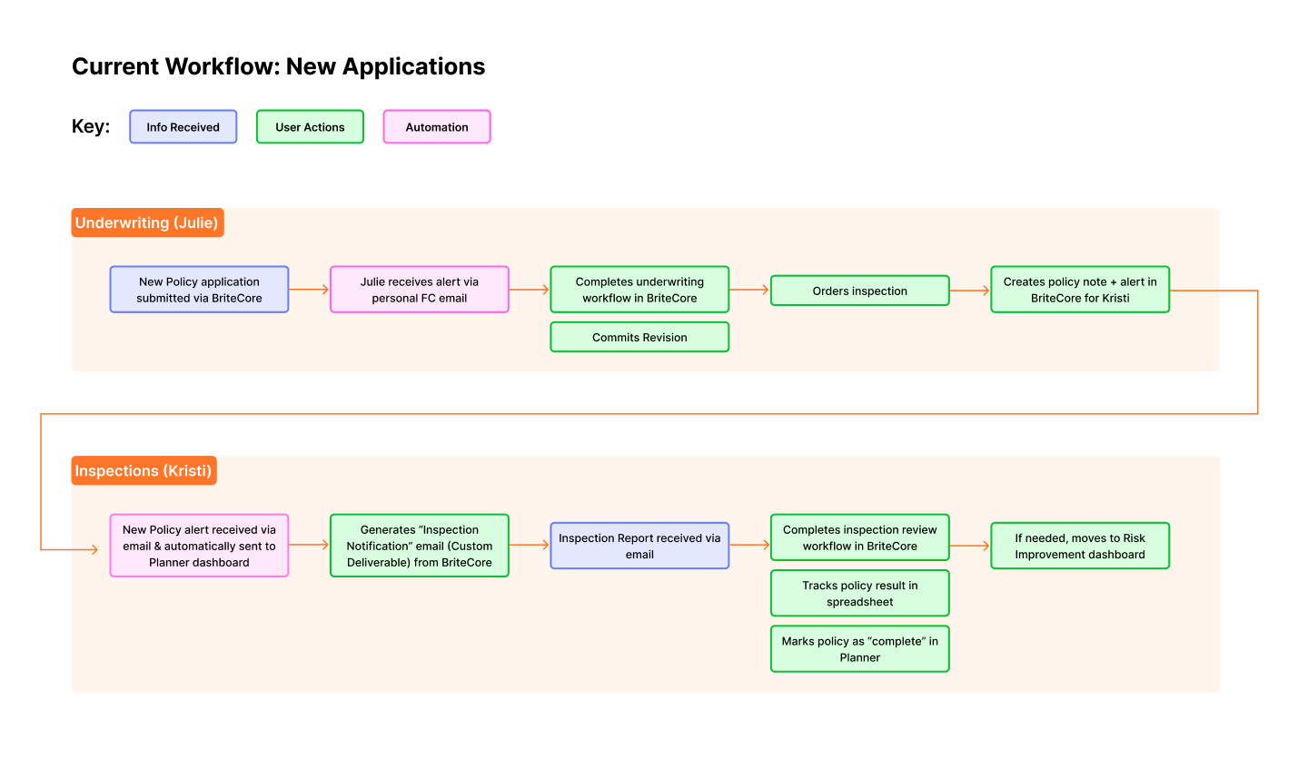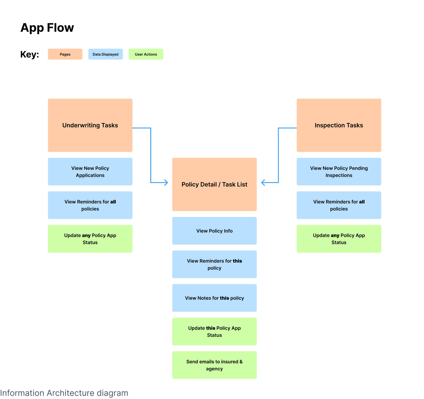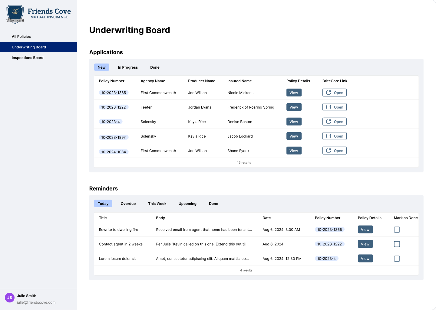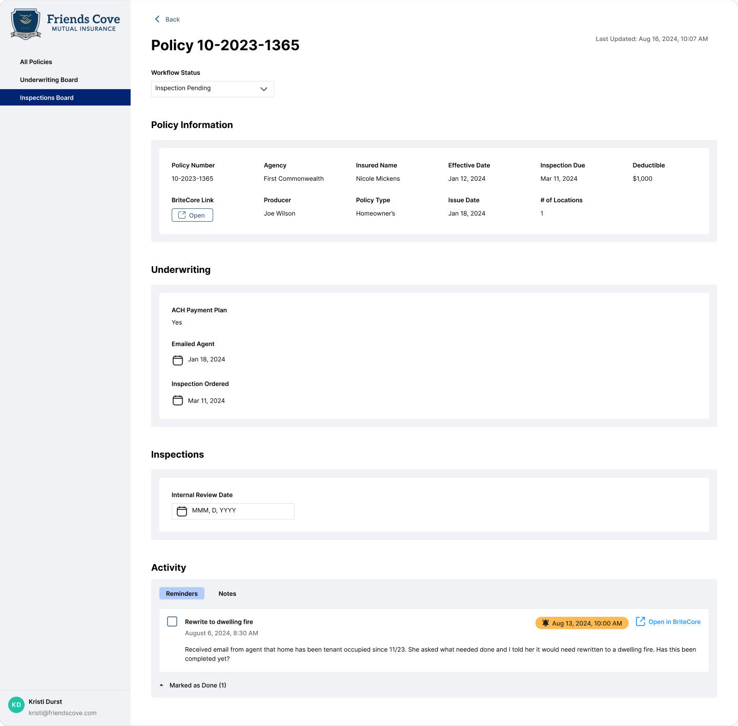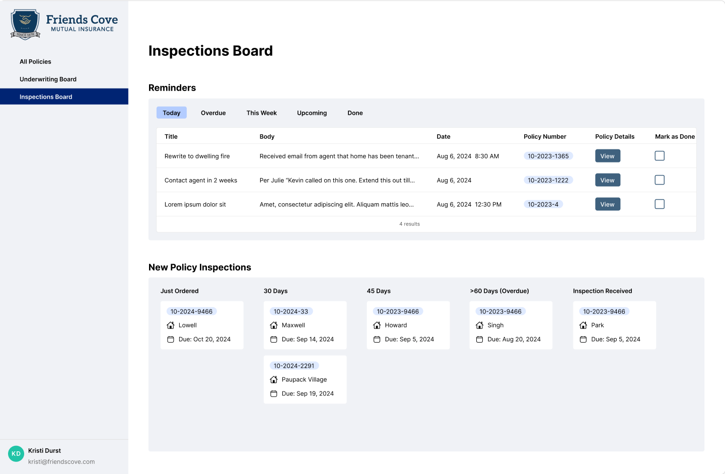 I designed a solution for the Friends Cove underwriting and inspection teams that integrates seamlessly with their Policy Admin System and provides each team with a customized view of incoming policy applications and upcoming deliverables.