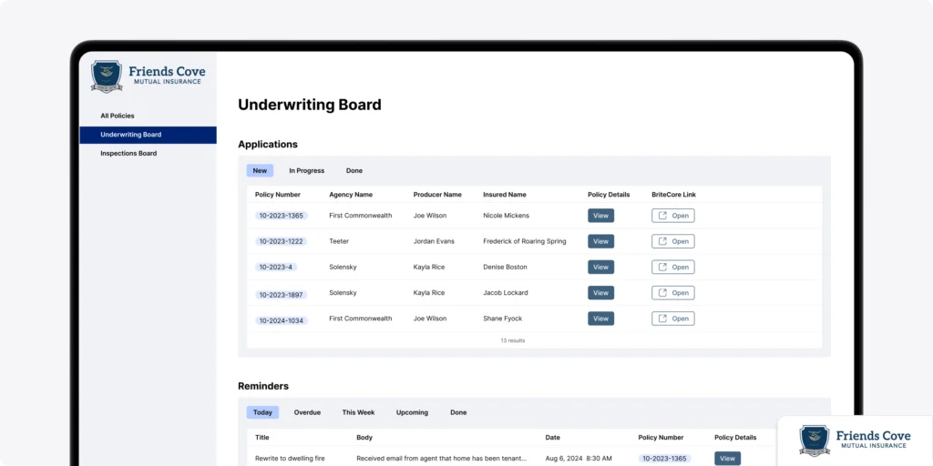 The Friends Cove team provides home and commercial insurance, working directly with insurance agents to track and manage thousands of policies, receiving dozens of new policy applications every week. The underwriting and inspections teams complete the bulk of their work using a Policy Admin System tool that stores all active and inactive policies, allowing them to review and update policy data, order inspections, as well as make notes and set reminders.