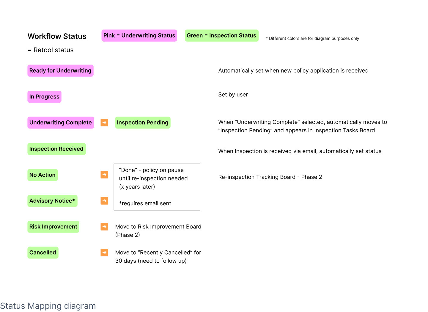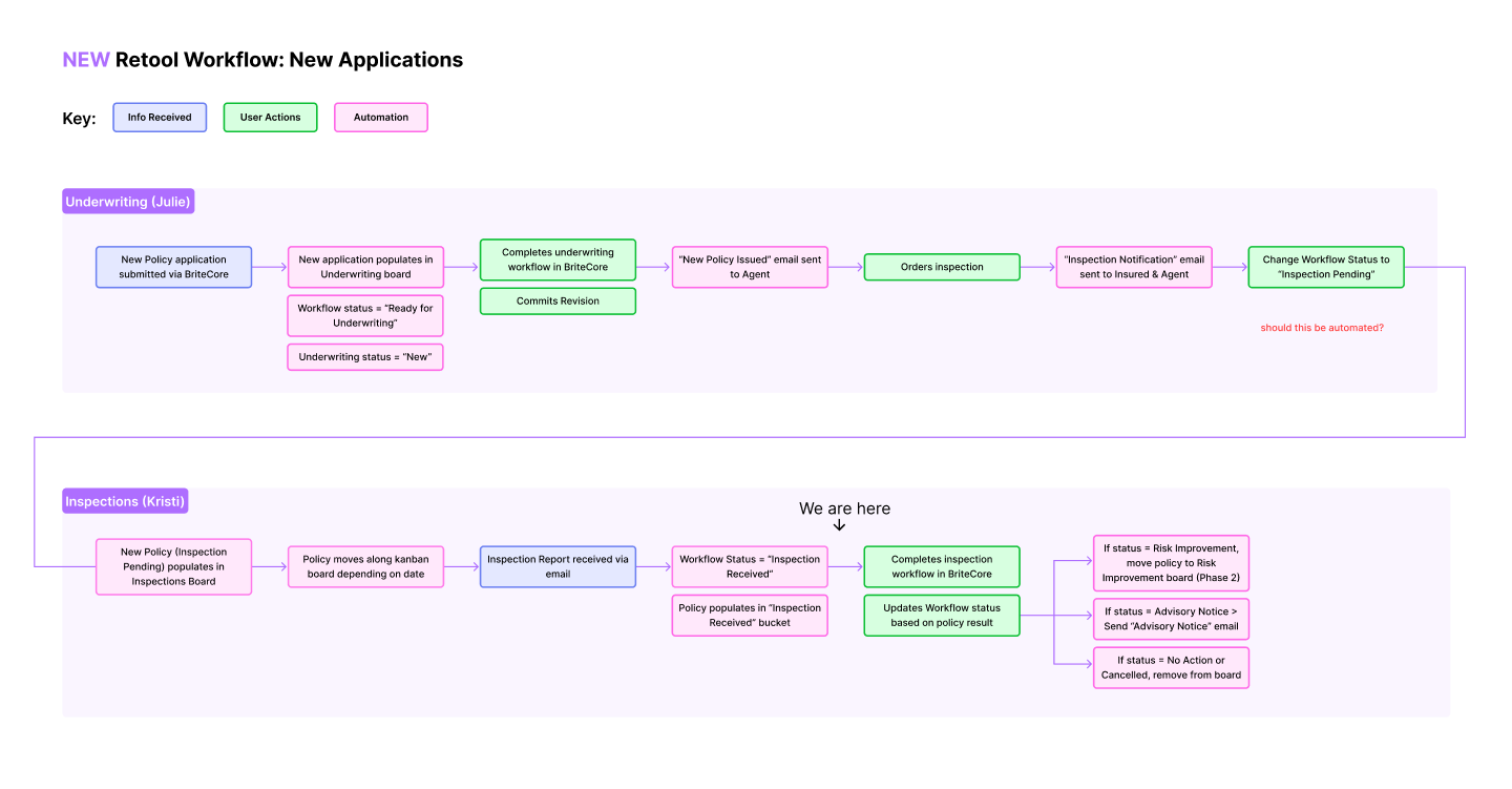 I created flowcharts for both the current and new workflows and defined the new statuses to be used in the Retool app.