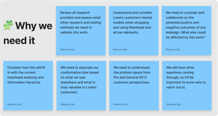 Advocating for tool access: While Lowe’s had all the tools needed, they were gated off from the UX team. Once I successfully advocated for granted access, I helped our team return to the fundamentals of observational research and unlock the problems more efficiently.