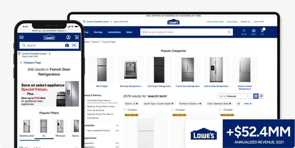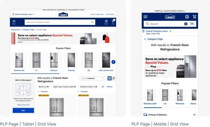 - Testing customers’ “ready to buy” points and timing: I tested different recommendation carousels to understand which are helpful and welcome to Lowe’s customers on a Product / Search listing results page, where our pages come into place to help customers convert their buy intent into action.